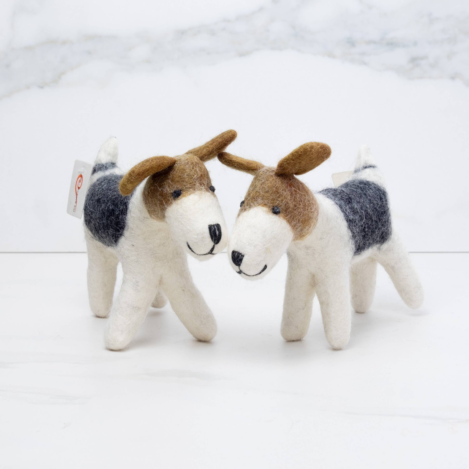 Our hand-felted dog, inspired by the Jack Russell Terrier, is sure to match its spirited and energetic personality in the hands of a child! Our felt doggies are the perfect toy companion to spark your storytelling or playtime adventures! Handmade with care in Kathmandu, Nepal in a small family-owned workshop that follows fair trade practices and strives to improve the standard of living for their artisans. Made from 100% organic wool and Azo free dyes. Approx. 5" High, 2.5" wide and 7" nose to tail.
